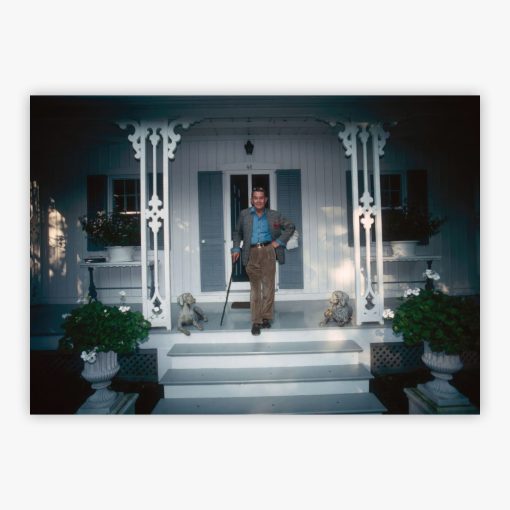 Albert Hadley captures the American interior design legend in an intimate moment at his weekend sanctuary in Southport, Connecticut, during October 1991. Slim Aarons photographed Hadley, co-founder of the legendary Parish-Hadley Inc., relaxed on his porch, embodying the sophisticated ease that defined his revolutionary approach to American interiors. The image reveals the man who transformed how we think about living spaces, his casual weekend setting providing a glimpse into the personal style of someone who shaped a generation's aesthetic sensibilities.