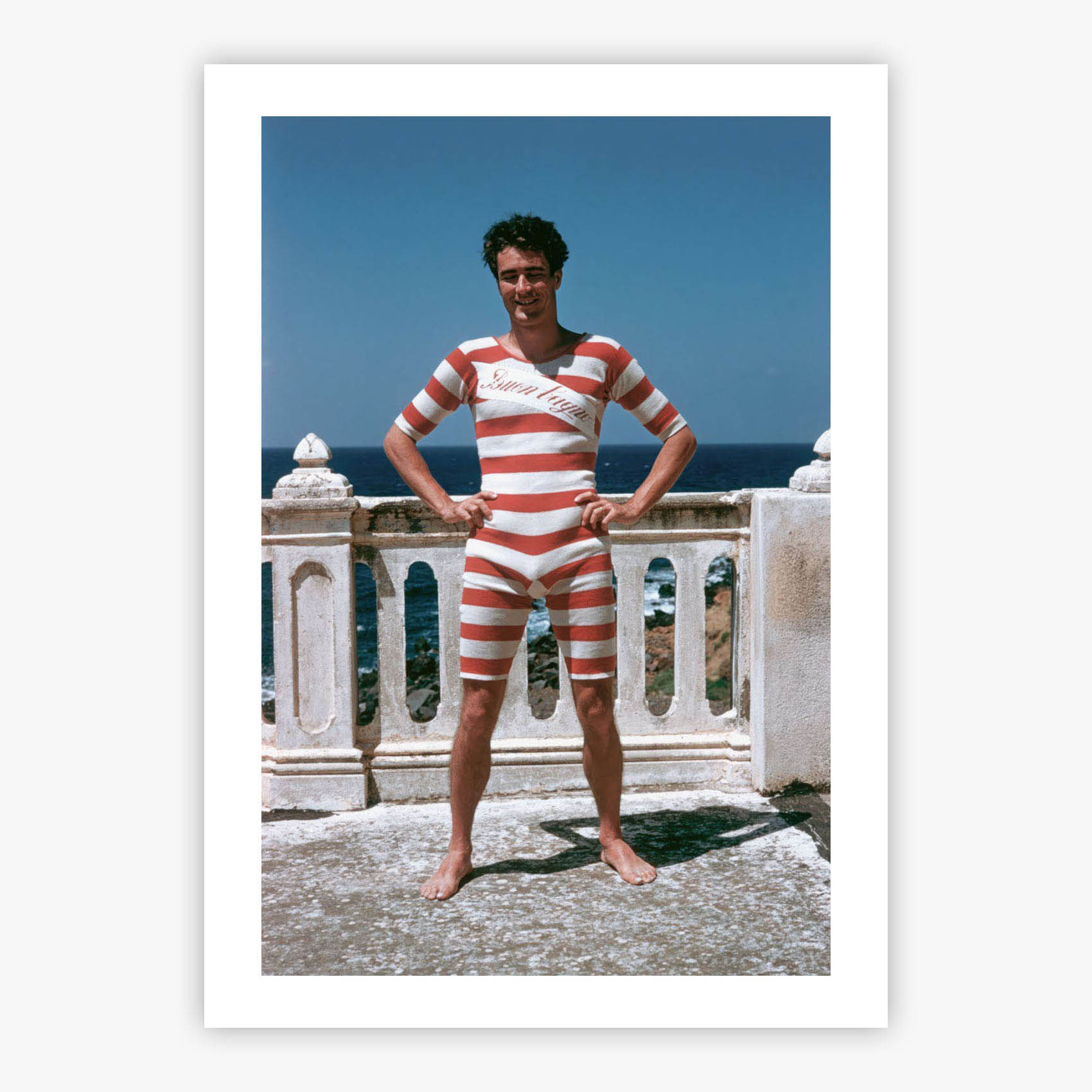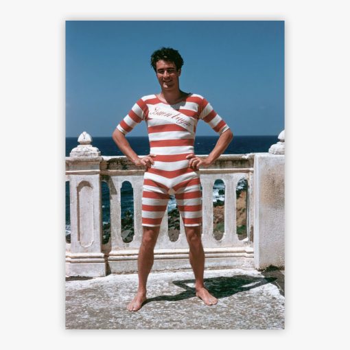 Andrea Hercolani transports you to sun-drenched 1950s Sicily, where Conte Don Andrea Hercolani, the 10th Prince Hercolani, relaxes in his distinctive red and white striped swimsuit. Slim Aarons, celebrated for capturing high society at leisure, orchestrates this enthralling photograph that embodies an era of unwavering elegance and sumptuous Mediterranean living. The composition reveals the prince's effortless aristocratic charm against the timeless backdrop of Sicilian opulence, preserving a moment when leisure itself was an art form perfected by Europe's most distinguished families.