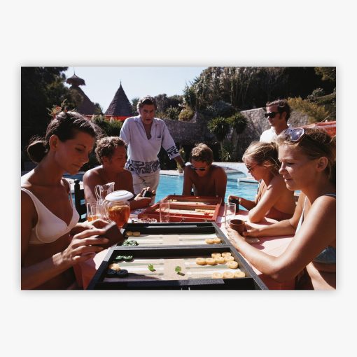 Immerse yourself in the carefree allure of the 1970s with Backgammon Players, a captivating photograph by celebrated photographer Slim Aarons. Captured at the exclusive Marbella Beach Club in Spain, this scene encapsulates a bygone era of leisure where sophisticated travelers engaged in spirited games of backgammon beside shimmering swimming pools. The photograph perfectly embodies the glamorous lifestyle that Slim Aarons became famous for documenting throughout his career.
