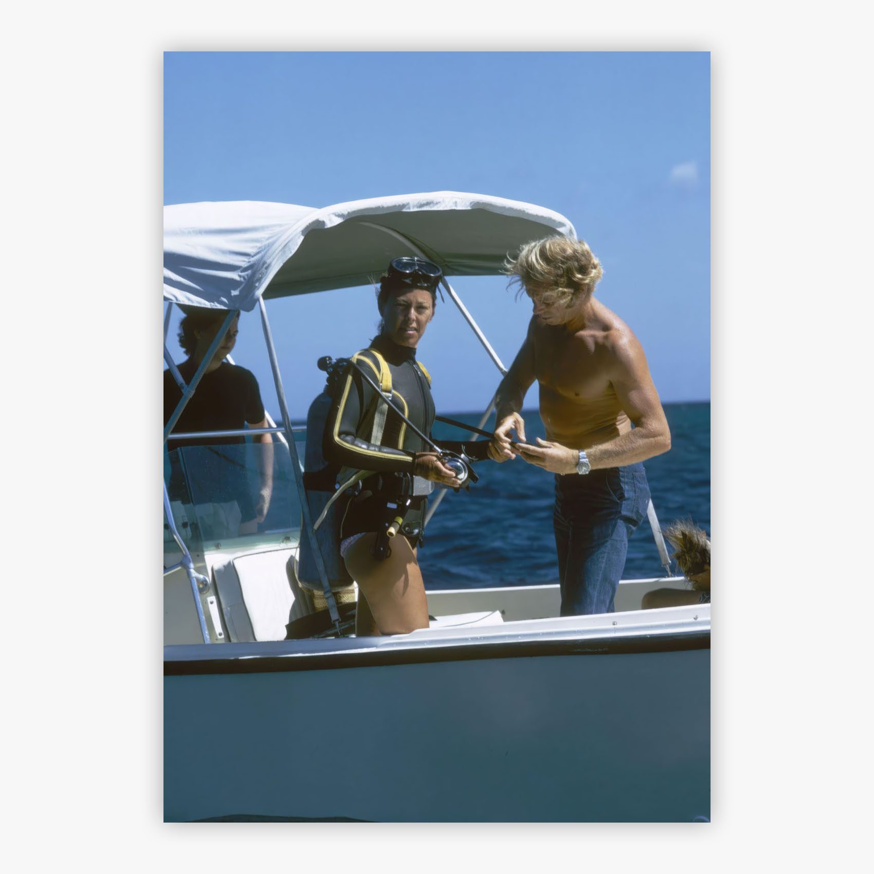 Baroness De Posson captures a moment of retro glamour and aquatic adventure, as Slim Aarons photographed Baroness Meriel de Posson and Tony Hill poised for a scuba dive in April 1974. The sparkling turquoise waters off Lyford Cay, New Providence Island create a stunning backdrop for this scene of vintage allure and oceanic intrigue. The vibrant composition showcases the elegance and adventurous spirit that defined an era of sophisticated leisure, where crystal-clear Caribbean waters met the world's most stylish travelers seeking both relaxation and excitement in equal measure.