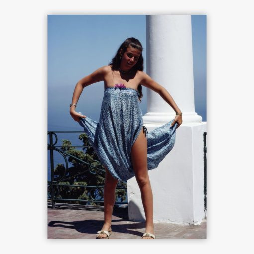 Blue Pareo captures a sun-drenched moment in Capri, Italy, where Maria Francesca della Morte demonstrates the elegant art of fastening a Tahitian pareo against the Mediterranean coastline. Slim Aarons photographed this scene in August 1980, bringing together the casual sophistication of Italian summer style with the timeless appeal of beachside leisure. The turquoise waters and rocky Capri landscape create a backdrop that speaks to the carefree elegance of European coastal living, where fashion and natural beauty converge in perfect harmony.