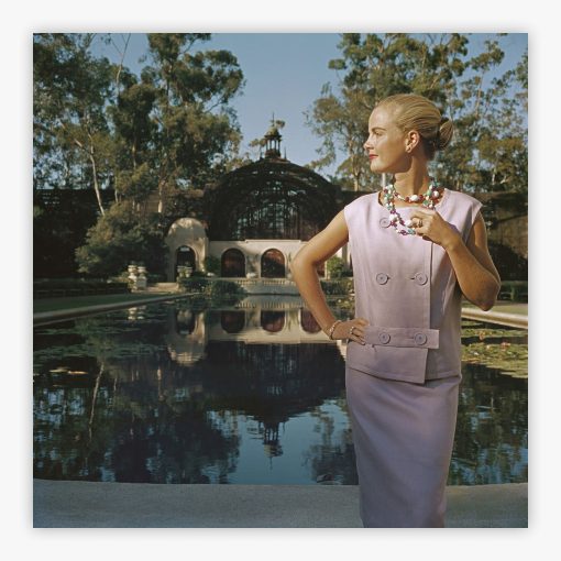 California Fashion presents the golden era of 1960s California through Slim Aarons' masterful lens, capturing Mrs Anne Ryan (née Evenson) in a sleeveless, two-piece ensemble by designer Maurice Rentner. She stands with effortless grace outside the Botanical Building in Balboa Park, San Diego, where the architectural splendor of the landmark pavilion frames this moment of West Coast sophistication. The image becomes a sublime blend of high fashion, historic architecture, and the distinctive spirit of an era when California defined American elegance.
