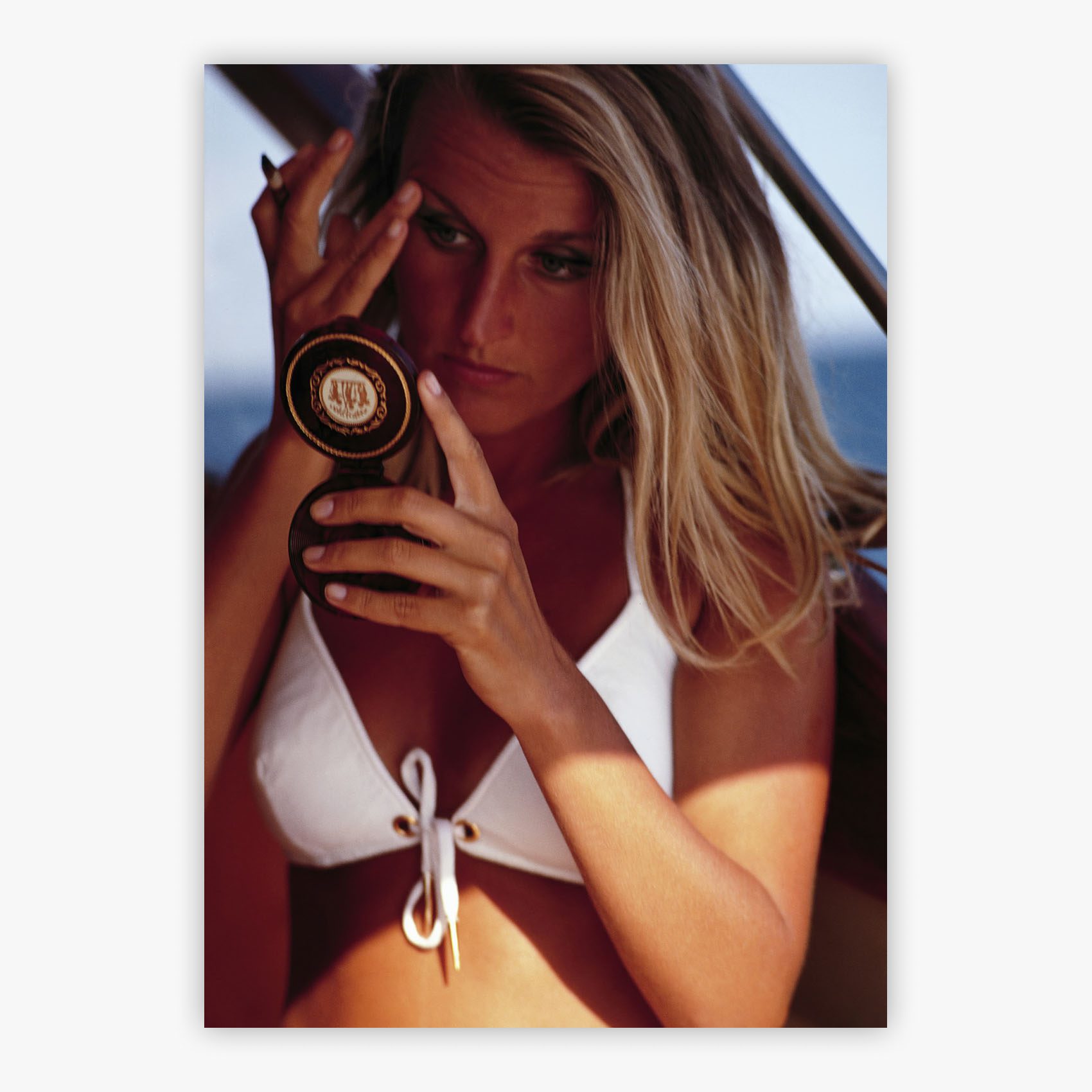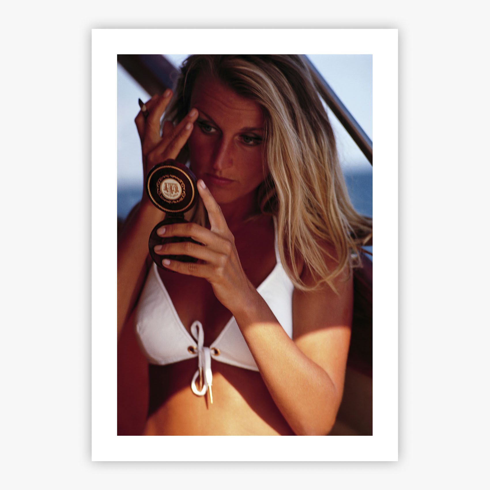 Catalano Makes Up captures a moment of quiet elegance as Elisabetta Catalano delicately checks her make-up in a hand mirror, photographed by Slim Aarons in Porto Ercole, Tuscany, in August 1969. This image transports you into a world where glamour meets everyday life, revealing the understated beauty of a sun-drenched afternoon along the Italian coast. The intimate scene showcases the photographer's remarkable talent for finding extraordinary moments in seemingly ordinary settings, creating a visual narrative that resonates across decades.
