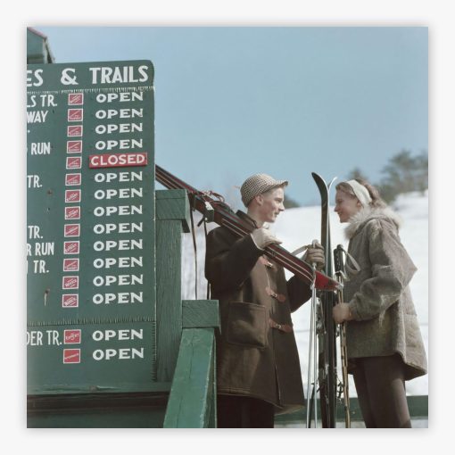 Cranmore Mountain transports you to the slopes of North Conway, New Hampshire, circa 1955, where Slim Aarons captured two skiers in conversation beside a vintage information sign. The nostalgic charm radiates through every detail, from the classic ski attire to the weathered wooden signpost, creating a window into the golden era of American skiing. You can almost feel the crisp mountain air and sense the camaraderie of a simpler time, when conversations on the slopes were as treasured as the runs themselves.