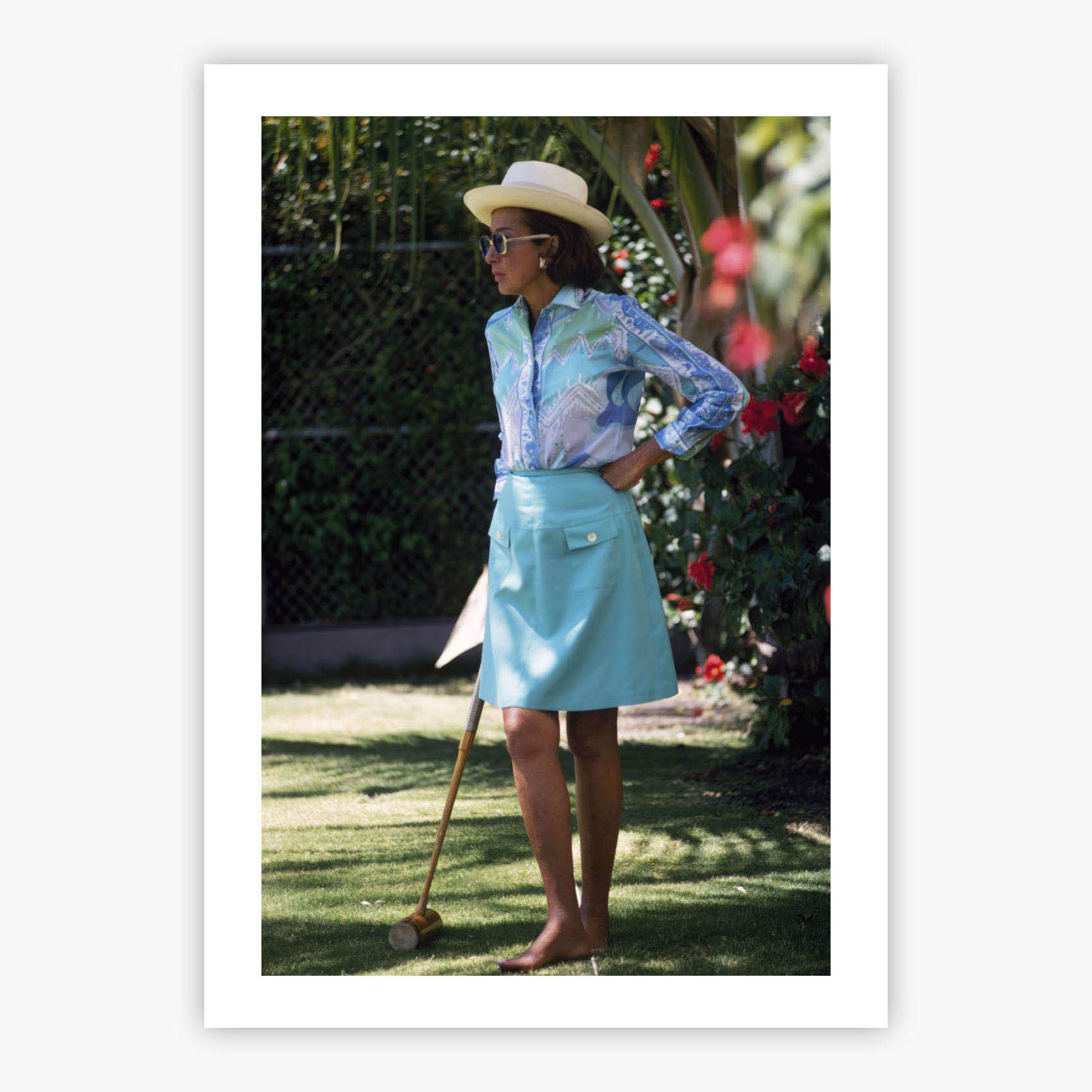 Croquet transports you to Palm Beach, Florida in 1968, where Slim Aarons captured a woman poised with mallet in hand, ready to strike the croquet ball on a sun-drenched afternoon. Enveloped by lush greenery, this composition effortlessly encapsulates the leisurely elegance of mid-century America that Slim Aarons portrayed with such mastery. The photograph radiates that unique ability to make even the simplest activities glow with glamour, presenting a slice of Americana where social gatherings were an art form and leisure defined a lifestyle.