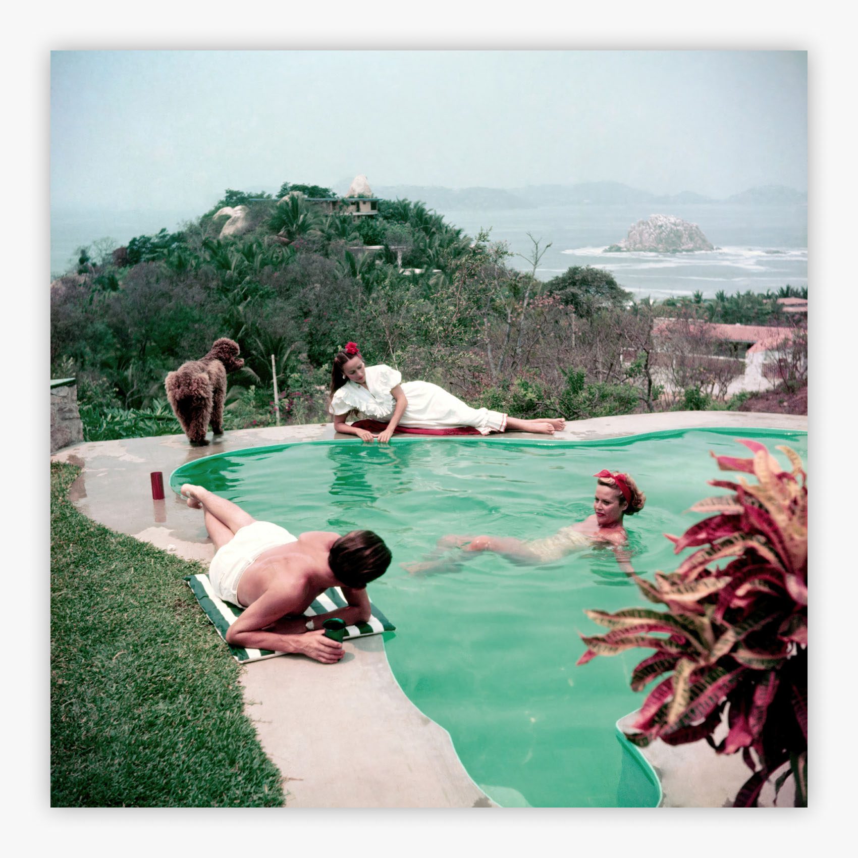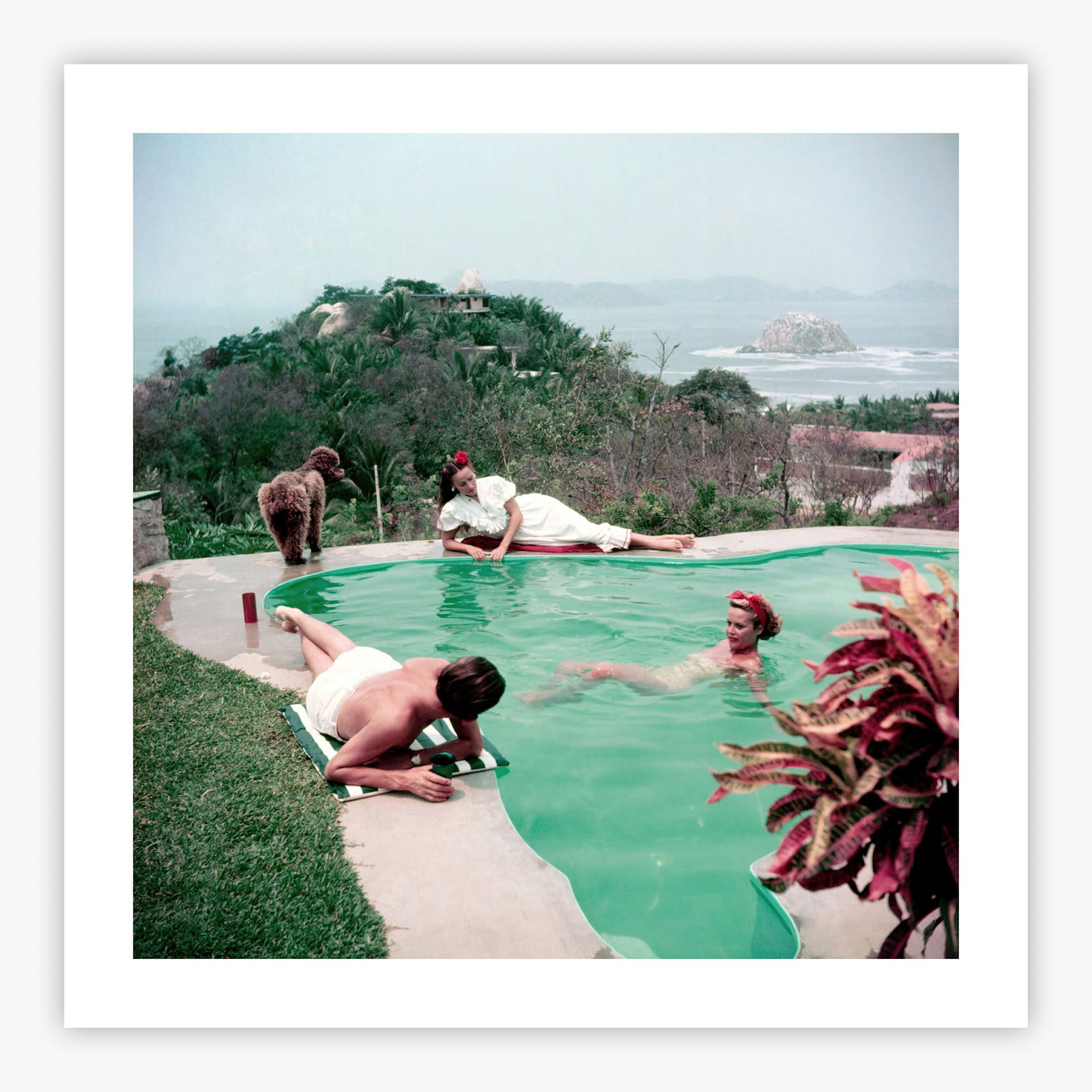 Del Rio By The Pool captures Mexican film icon Dolores Del Rio in a radiant afternoon beside an Acapulco pool in 1952, accompanied by her friend Micki Salle and a charming poodle. Slim Aarons immortalized this moment of pure sophistication, where Del Rio, the centerpiece of this mesmerizing tableau, embodies the epitome of poise and beauty in her elegant swimwear. The scene radiates timeless glamour, from the crystalline pool waters to the lush tropical setting, transporting viewers to an era when Mexican high society met Hollywood elegance at exclusive retreats along the Pacific coast.