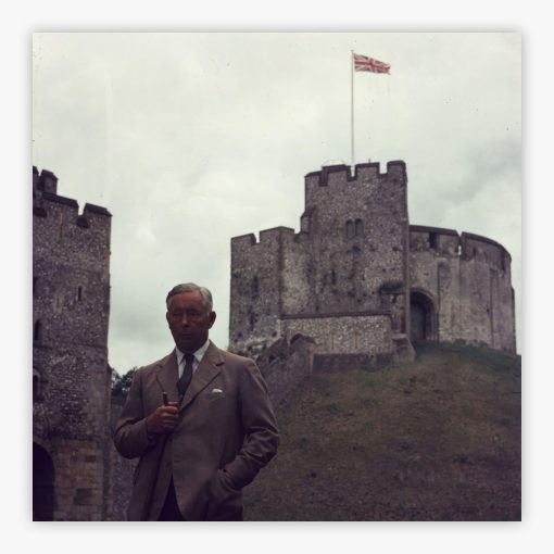 Duke of Norfolk captures Bernard Fitzalan Howard, the 16th Duke, standing with dignified authority outside the storied Arundel Castle in Sussex, where Slim Aarons photographed this remarkable moment of British aristocratic heritage. The Union Jack billows behind him against the castle's ancient stone walls, symbolizing the enduring legacy that has been anchored to this seat of power for generations. His commanding presence, framed by centuries of history, reveals the photographer's masterful ability to capture not just a portrait, but an entire world of tradition and noble bearing in a single frame.
