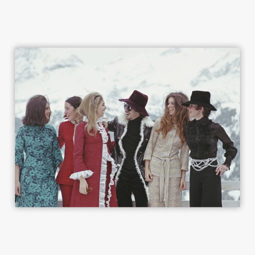 Whether placed in a minimalist living room or an opulent study, this print becomes an instant focal point that fuses beautifully with diverse design aesthetics. You're not merely hanging a photograph but installing a window to a bygone era of glamour, capturing the essence of an afternoon when the world's most stylish gathered in the Swiss Alps. Available professionally printed and framed to museum standards, this piece lets your walls tell stories of elegance and camaraderie that transcend generations.