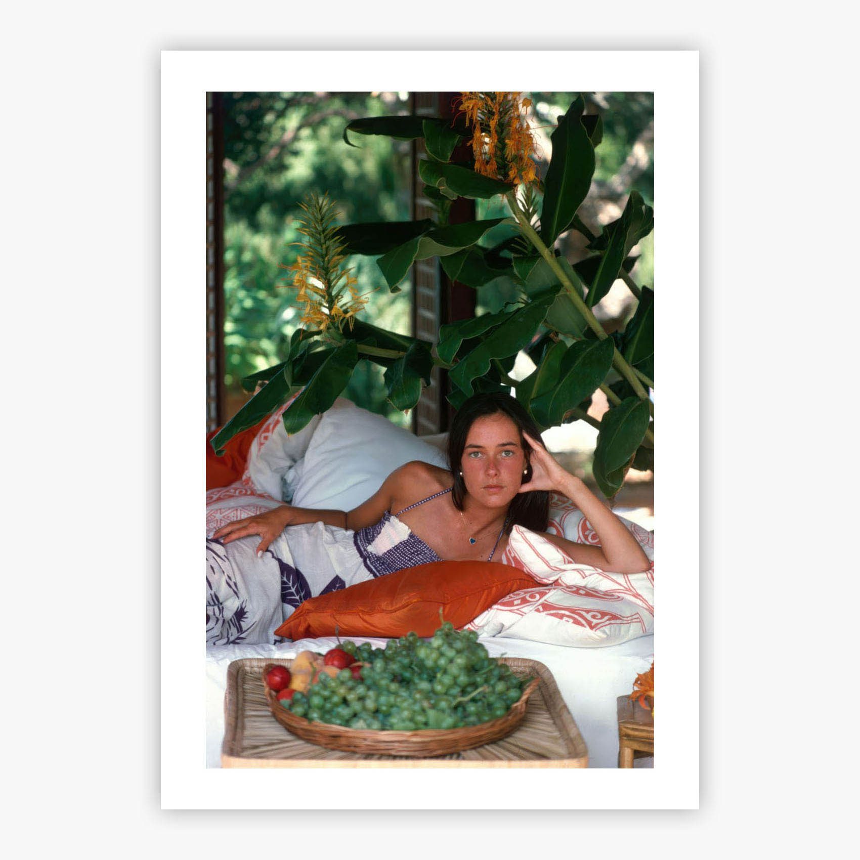 Fruit And Flowers transports you to the sun-drenched elegance of Sotogrande in 1975, where Beatriz Herrero-Vicuna reclines in a moment of unhurried grace. Slim Aarons captured her lounging beside a dish of succulent grapes, the scene epitomizing the refined leisure that defined Spain's golden coast. The photograph reveals more than a peaceful afternoon; it showcases the art of living well, where sophistication flows as naturally as the Mediterranean breeze. This is an invitation to an era when luxury meant savoring life's simplest pleasures in the most beautiful settings.