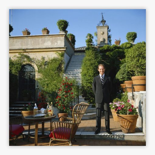 Giovanni Volpi Di Misurata captures the Italian count in a moment of serene grandeur on the piazza of Palazzo Volpi, his ancestral home in Rome. Photographed by Slim Aarons in May 1981, this composition immortalizes heritage and personality through the lens of masterful photography. Giovanni Volpi di Misurata stands gracefully before his family palazzo, embodying the aristocratic elegance that defined Roman high society. The scene reveals classic Italian architecture framing a man at ease in his historic surroundings, where centuries of family legacy meet the sophistication of mid-century glamour photography.