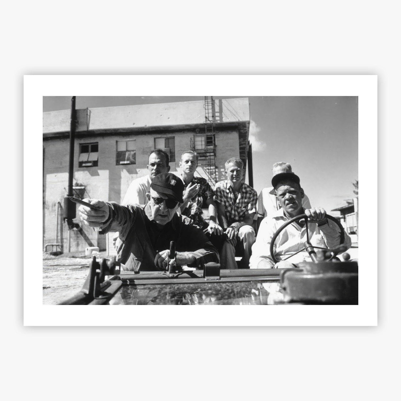 Go That Way captures a remarkable moment of cinematic history as Slim Aarons photographed legendary director John Ford and his film crew scouting Hawaiian locations in 1955 for the production of Mister Roberts. The black and white composition shows Ford in casual attire, gesturing purposefully while his crew stands ready with cameras and equipment, the lush tropical landscape stretching behind them. This photograph embodies the spirit of classic Hollywood adventure, when film production meant true exploration and discovery, bringing the golden age of American cinema directly into your living space.