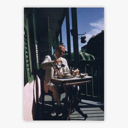 Josh Logan captures a quintessential New Orleans morning in 1953, where the celebrated stage and screen producer pauses on his wrought-iron balcony, coffee cup in hand, bathed in the soft southern light. Slim Aarons transformed this intimate moment into an enduring portrait of mid-century American elegance, where the ornate balcony railings frame the producer against the backdrop of the French Quarter. The relaxed yet refined atmosphere reveals Logan in contemplative repose, his morning ritual elevated into visual poetry that speaks to the sophisticated leisure of postwar America.