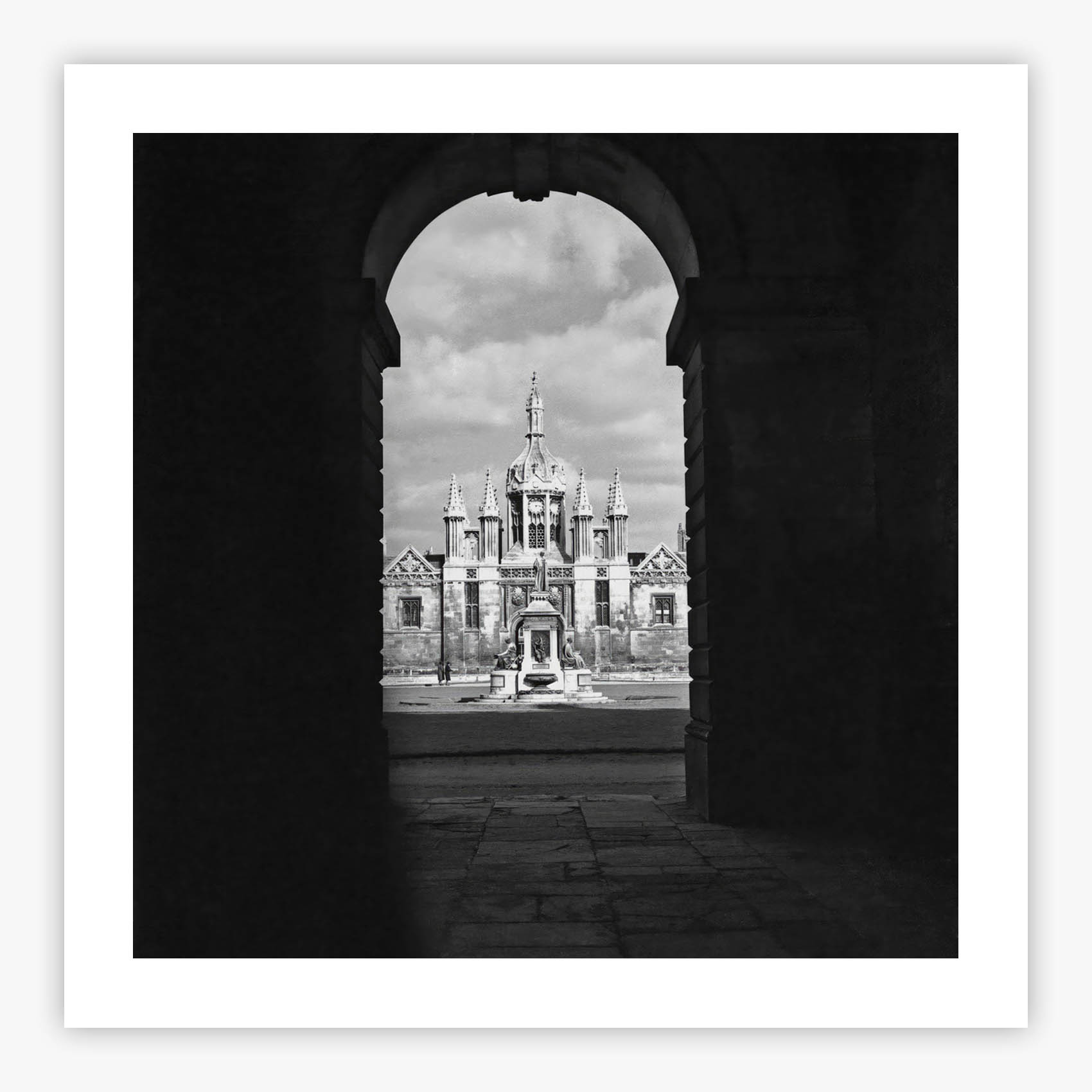King's College Gatehouse offers a window through an archway, overlooking the Great Court towards the neo-gothic Gatehouse at King's College, Cambridge, captured by Slim Aarons circa 1949. The frame within a frame composition draws the eye through layers of architectural grandeur, inviting you to step across centuries of scholarly tradition. Stone arches frame the distant Gatehouse, its gothic spires reaching skyward, while the cobbled courtyard spreads between ancient walls that have witnessed generations of Cambridge life, all rendered in Aarons' signature style that elevates documentary photography into timeless art.