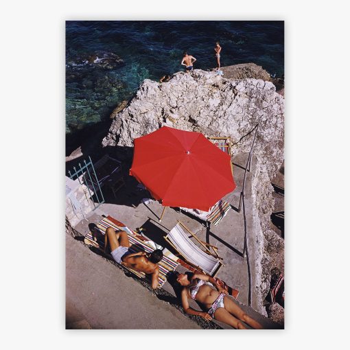 The scene captures the moment when beach clubs stopped following coastlines and started sculpting them instead. Slim Aarons photographed this triumph of human ingenuity over natural obstacles, where British entertainer Gracie Fields proved that the best views required the boldest interventions. Slim Aarons understood that this red umbrella marked more than shade but a flag planted in conquered territory, where those who shaped society carved their playground from ancient cliffs on Capri. Position this print where conversations about design and daring intersect, allowing the geometric precision of terraced pleasure to remind viewers that the best resorts create their own geography.