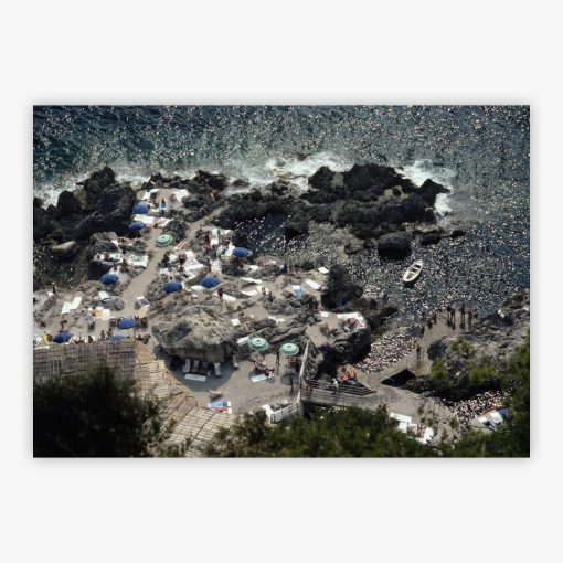 La Fonteline captures the essence of Italian coastal living beneath the majestic Faraglioni rocks of Capri, where sun-kissed shores meet Mediterranean waters in perfect harmony. Slim Aarons transports you to this idyllic stretch of beach, where striped umbrellas dot the sand and limestone cliffs frame an endless summer afternoon. The turquoise waters shimmer in the Italian sun while beachgoers enjoy the timeless ritual of seaside leisure that has defined Capri for generations. This photograph preserves a moment when life moves at the gentle pace of lapping waves, offering you a window into the sophisticated simplicity of Riviera living that transforms any space into a sanctuary of wanderlust.