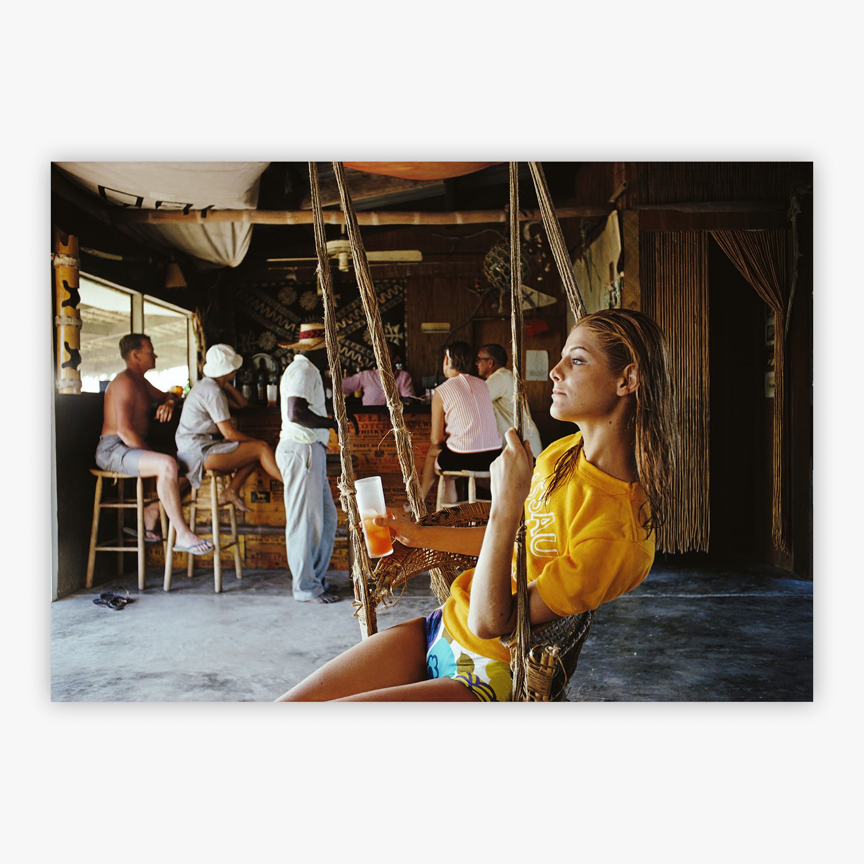 Life In The Bahamas captures the sun-soaked allure of April 1967, where a woman sways gently in a hanging wicker chair, tropical drink in hand, as convivial guests gather at the thatched-roof bar behind her. Slim Aarons photographed this quintessential moment of Caribbean leisure, preserving the Bahamas at its most inviting. The scene radiates effortless enjoyment, from the woman's relaxed pose to the casual elegance of the poolside setting, where palm fronds frame a perfect afternoon and the spirit of island life flows as freely as the cocktails.
