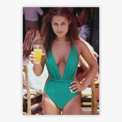 Marbella, Spain captures Simone Levin in an aqua green trikini, her hand elegantly holding a soda glass against the sun-soaked backdrop of the Mediterranean coast, circa 1980. Slim Aarons preserved this moment of effortless sophistication, where Spanish coastal glamour meets the high society leisure that defined international jet-set living along the Costa del Sol. The photograph embodies that perfect balance of style and relaxation, presenting the essence of summer elegance that made Aarons' work synonymous with aspirational lifestyle imagery throughout his legendary career.