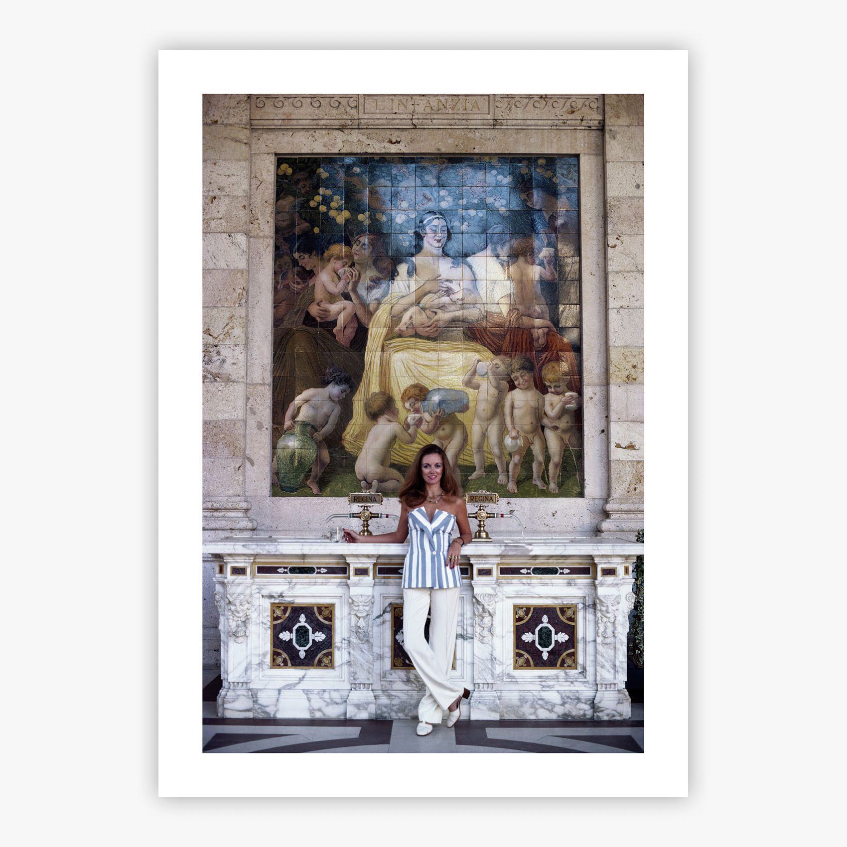 Marie-Louise Scio captures a defining moment of 1980's Italian glamour, as Slim Aarons photographed the subject poised with understated elegance before the ornate water fountain at Tettuccio Terme in Montecatini, Italy. The elaborate fountain with its classical architecture and cascading waters creates a backdrop of timeless European sophistication, while the subject's confident stance and refined presence embody the grace that made this era unforgettable. Every element in this composition, from the intricate fountain details to the interplay of light on water, speaks to the mastery of a photographer who understood how to frame moments of pure elegance.