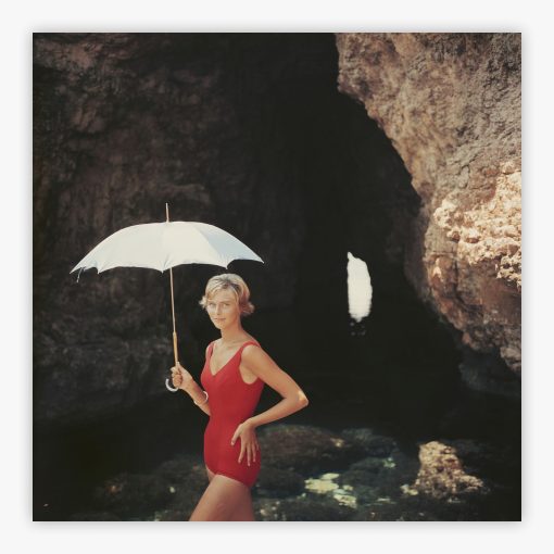Marietine Birnie captures a moment of pure Mediterranean elegance on the serene Inland Sea of Gozo, Malta, in July 1959. Slim Aarons framed this striking scene where Marietine stands poised with her parasol, embodying the effortless grace of 1950s high society against the tranquil waters. The composition reveals his celebrated talent for portraying leisure with sophistication, where natural beauty and refined style converge in perfect harmony. Every element works together to create a timeless vision of elegance that transcends decades.