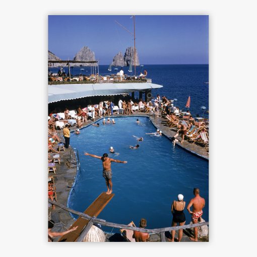 Slim Aarons captured this quintessential Riviera moment when this famed establishment reigned as Capri’s most glamorous destination, frequented by Burton and Taylor, Garbo and Coward. This museum-quality photograph adds sophisticated elegance to contemporary interiors through its masterful composition of geometric pool lines against organic rock formations. Marina Piccola delivers the warmth of Neapolitan summers into your living space, where turquoise seas and sun-bleached stone create a palette that complements both modern minimalism and classic seaside design. The energy of people mid-stroke and divers suspended in anticipation infuses any room with movement and vitality.