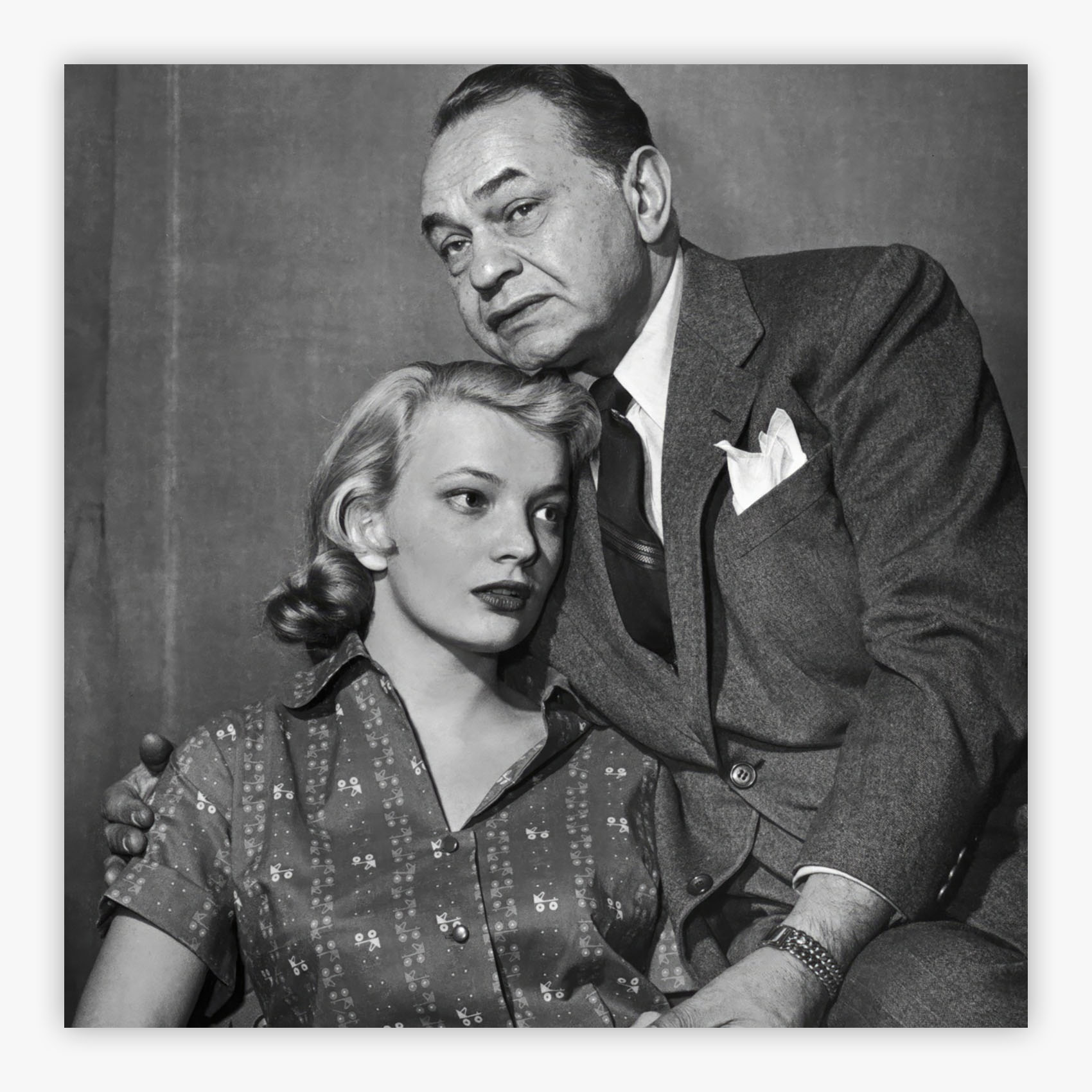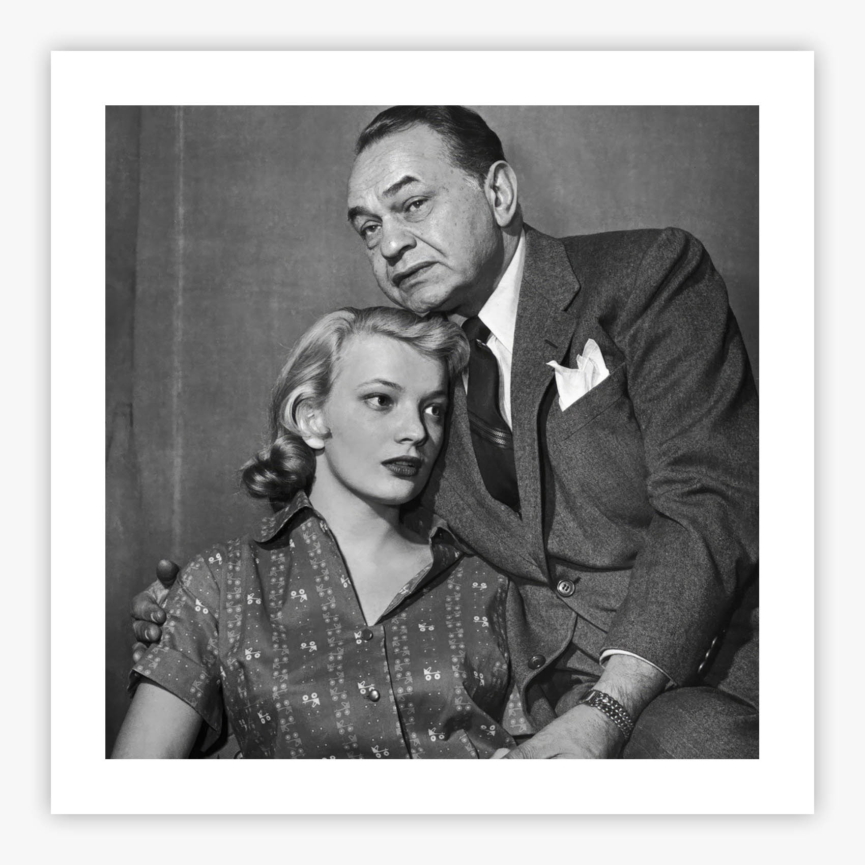 Middle of the Night captures the electric intensity of 1950s Broadway, where Slim Aarons photographed Gena Rowlands and Edward G. Robinson during the original 1956 production of Paddy Chayefsky's celebrated play. The theatrical staging reveals two performers caught in a moment of dramatic tension, their expressions conveying the emotional depth that made this production legendary. Rich period details from the set design transport you to an era when Broadway represented the pinnacle of American theater, while the photographer's signature style transforms a backstage moment into an elegant visual narrative that speaks to the artistry of live performance.