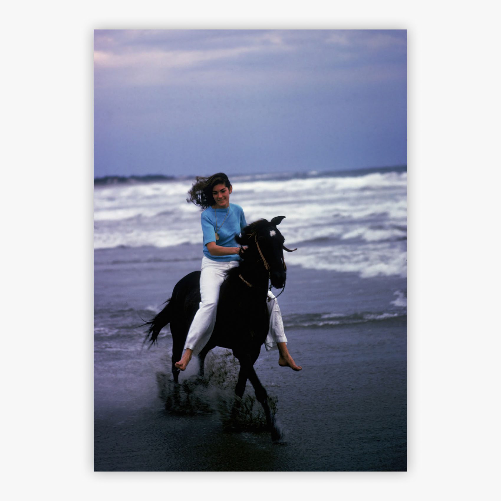 Capture the essence of a bygone era with this evocative masterpiece, where Minnie Cushing, a quintessential American society girl, takes a leisurely ride along a picturesque Acapulco beach in 1972. This image, immortalized through the lens of the renowned Slim Aarons, exudes a timeless allure that remains captivating to this day. The scene transports you to a serene beachfront where the elegance of equestrianism meets the laid-back vibes of Acapulco, perfectly capturing Slim Aarons' signature style of documenting the privileged at play.