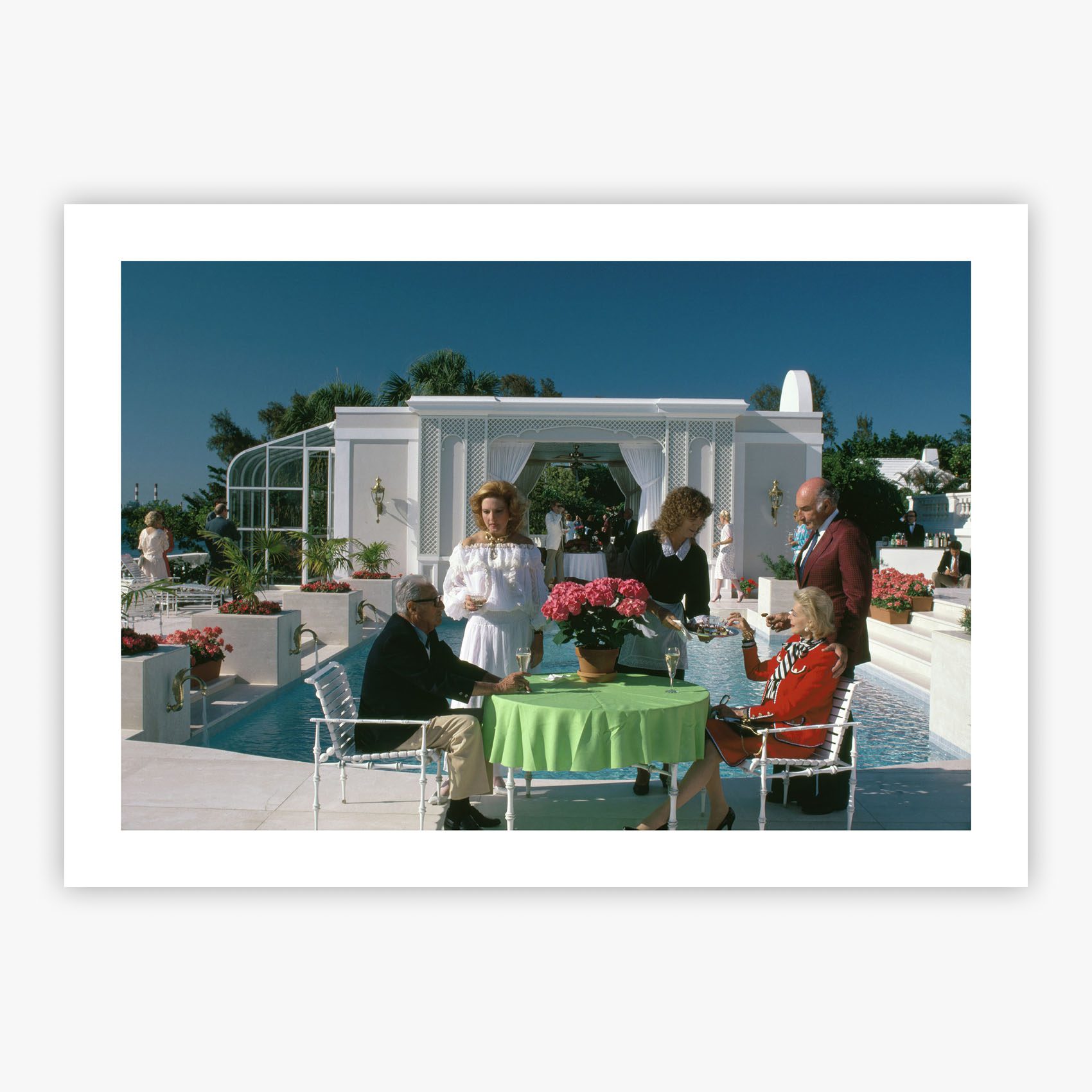 This classic print integrates seamlessly into contemporary interiors while maintaining its vintage charm and historical significance. Whether displayed in a modern minimalist setting or a traditional Palm Beach-inspired space, this photograph brings warmth, color, and a touch of social history to your walls. The poolside composition and bright Florida sunshine make this piece particularly striking in living areas, pool houses, or any space that celebrates the indoor-outdoor lifestyle.