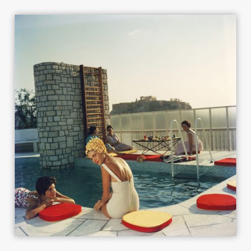Penthouse Pool brings you to Athens in the summer of 1961, where young women lounge beside the rooftop sanctuary of the Canellopoulos residence, their figures silhouetted against endless Mediterranean sky. Slim Aarons captured this sun-drenched afternoon when leisure meant more than simply relaxing; it represented a lifestyle of sophistication and beauty. The pool’s edge frames casual elegance, while the scene radiates the carefree spirit of an era when summer afternoons stretched into golden evenings, and every moment held the promise of connection and grace.