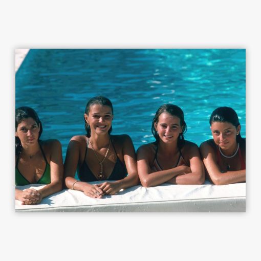 Pool Buddies captures a sun-drenched afternoon in Sotogrande, Spain, where Slim Aarons photographed Eugenia Melian, Sandra Milans de Rothschild, Sylvia Melian, and Sandra Vallejo Natero Zobel sharing an effortlessly elegant poolside moment in August 1975. The spontaneous gathering radiates the carefree sophistication that defined Mediterranean summer living, with each woman embodying the relaxed glamour of Spain's coastal elite. This photograph transcends simple documentation to become a window into an era when leisure itself was an art form, inviting you to embrace that same spirit of unhurried refinement in your own space.