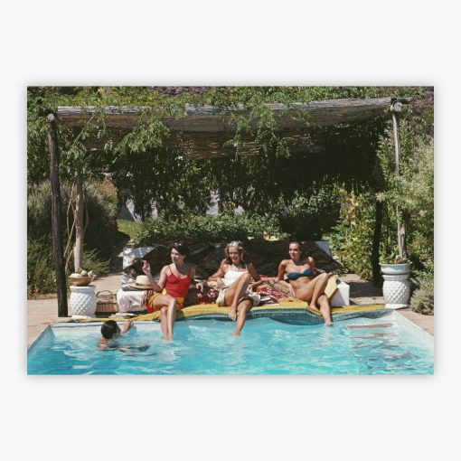 Poolside In Benahavis reveals a sun-drenched afternoon where friends gather around a secluded pool in the hills near Marbella, Spain, as Slim Aarons captured this quintessential moment of 1980s Mediterranean leisure. Golden Spanish sunlight bathes the relaxed figures while the pristine pool mirrors the brilliant azure sky, creating that magical interplay between light, water, and unhurried conversation that defines true luxury. This captivating photograph doesn't merely show a scene but preserves an entire atmosphere, one that naturally brings laid-back sophistication and timeless European elegance into any contemporary space.