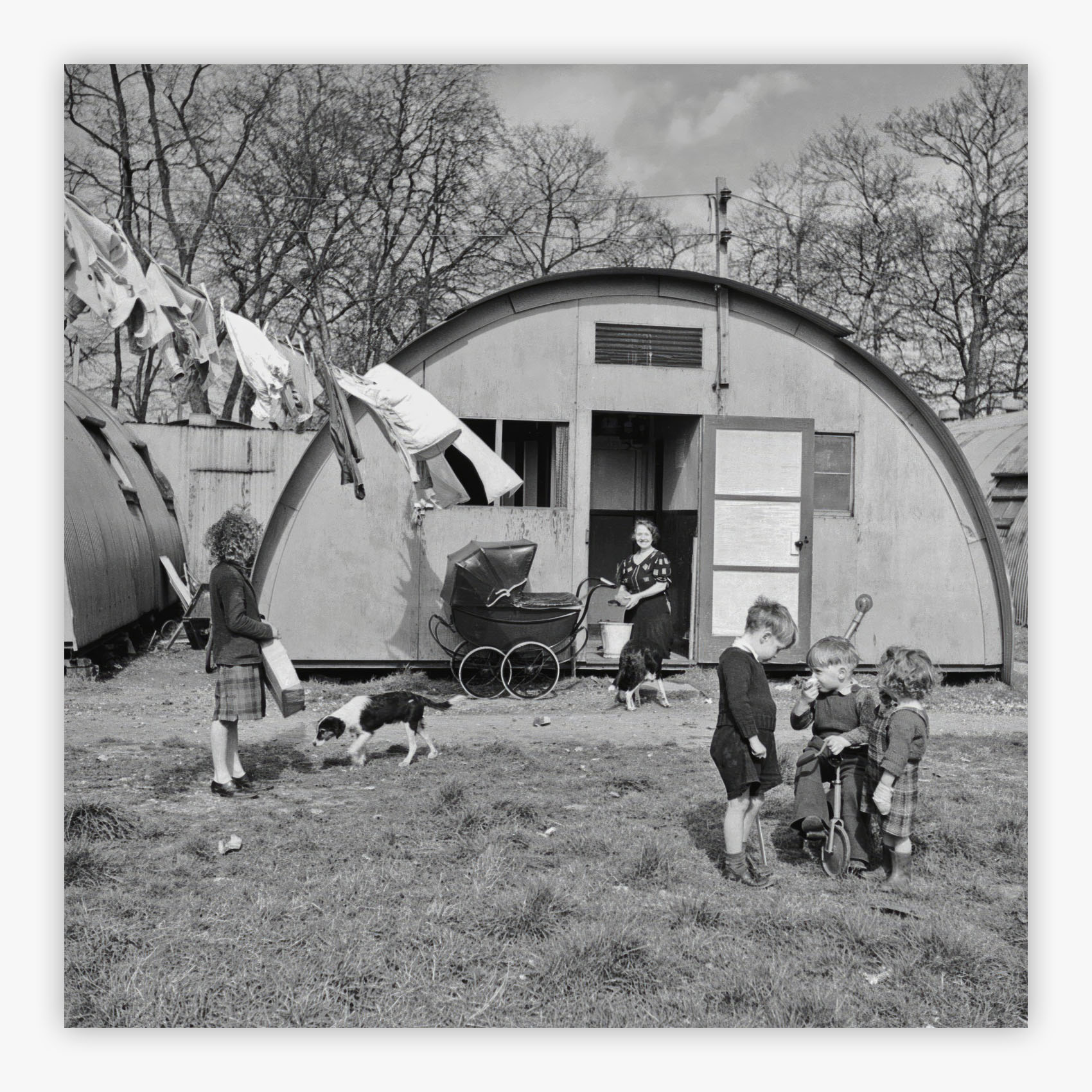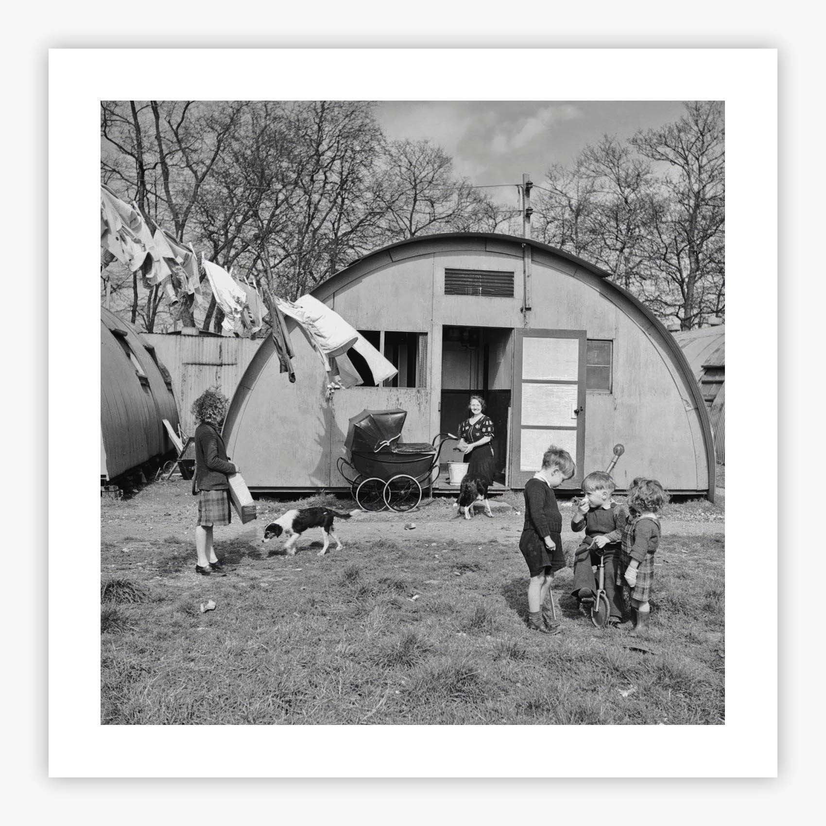 Prefabricated Home transports you to post-war Southampton in 1949, where Slim Aarons captured a resilient family making a life outside their temporary Nissen hut. Through his lens, you witness not just a photograph but an intimate tableau of post-war British resilience and familial unity. A woman in a floral dress tends to daily tasks while children play nearby, embodying the indomitable spirit of an era. The curved corrugated metal shelter, laundry hanging in the breeze, and the family's determined presence create a powerful narrative of hope and perseverance that resonates across generations.