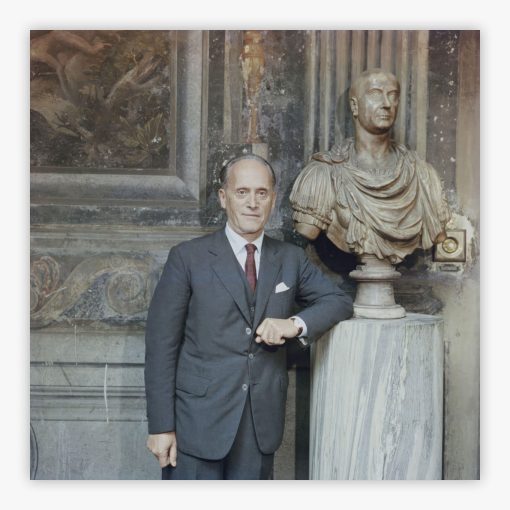 Prince Massimo captures Prince Leone Massimo in a moment of refined contemplation within his storied Roman residence, the Palazzo Massimo alle Colonne, circa 1960. Slim Aarons frames the Prince beside a classical marble bust, where ornate architectural details and centuries-old artworks create an atmosphere of Italian nobility meeting artistic heritage. The photograph reveals layers of history through its carefully composed elements: the sculptural perfection of the bust, the Prince's composed bearing, and the palazzo's baroque grandeur speaking to generations of distinguished lineage.