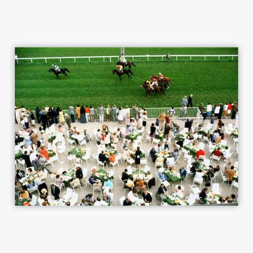 Racing At Baden Baden transports you to the open-air elegance of Germany's legendary racecourse in September 1978, where Slim Aarons captured spectators dining al fresco as thoroughbreds thunder past in brilliant afternoon light. The scene unfolds with effortless sophistication: well-dressed guests lean into animated conversation over white-clothed tables, champagne flutes catching the sun, their laughter and gestures creating an atmosphere of spontaneous joy against the blur of racing excitement. Every element, from the crisp linens to the relaxed postures of the crowd, speaks to a world where leisure and high society merge in perfect harmony.
