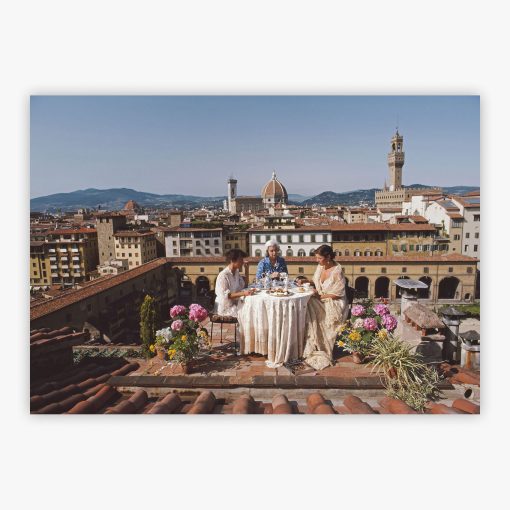 Slim Aarons' meticulous composition frames the scene with the majestic backdrop of the Basilica di Santa Maria del Fiore and the Palazzo Vecchio's tower, infusing the photograph with a sense of grandeur and history. Every detail, from the cascading vines to the elegant architecture, invites you to immerse yourself in the allure of Italian elegance and refinement.
