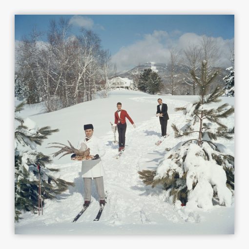 The men are dressed as waiters, but they carry the spirit of adventurers, making this piece a perfect fit for those who appreciate life's finer yet fun-filled moments. The snow-covered slopes of Stowe may be far away, but this picture-perfect moment can be forever yours, bringing a sprinkle of wit and a spoonful of wonder right into your home. This Slim Aarons print represents everything he was known for: capturing the beautiful people doing beautiful things in beautiful places, but with an unexpected twist that transforms any space into a gallery of sophisticated humor and timeless style.