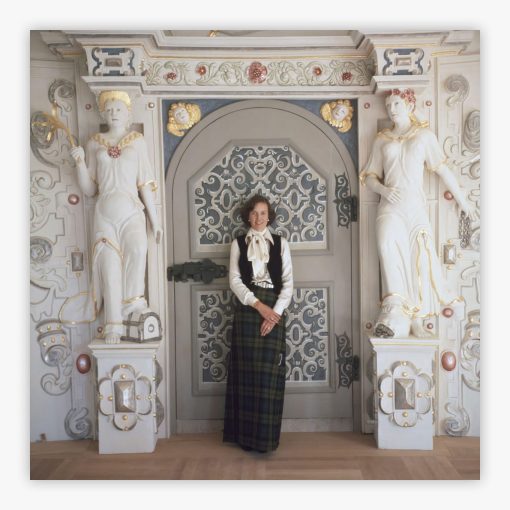 Her attire blends tradition and modern sophistication with a rich tartan skirt paired with a silk blouse and tailored vest that reflect her noble lineage while seamlessly aligning with mid-century European fashion. Natural light accentuates the depth of textures throughout this photograph, from the soft drapery of her garments to the polished wood flooring and finely sculpted marble statues that guard each side of the doorway. This composition offers more than a portrait, presenting a visual narrative of aristocracy, legacy, and the enduring elegance of European nobility.