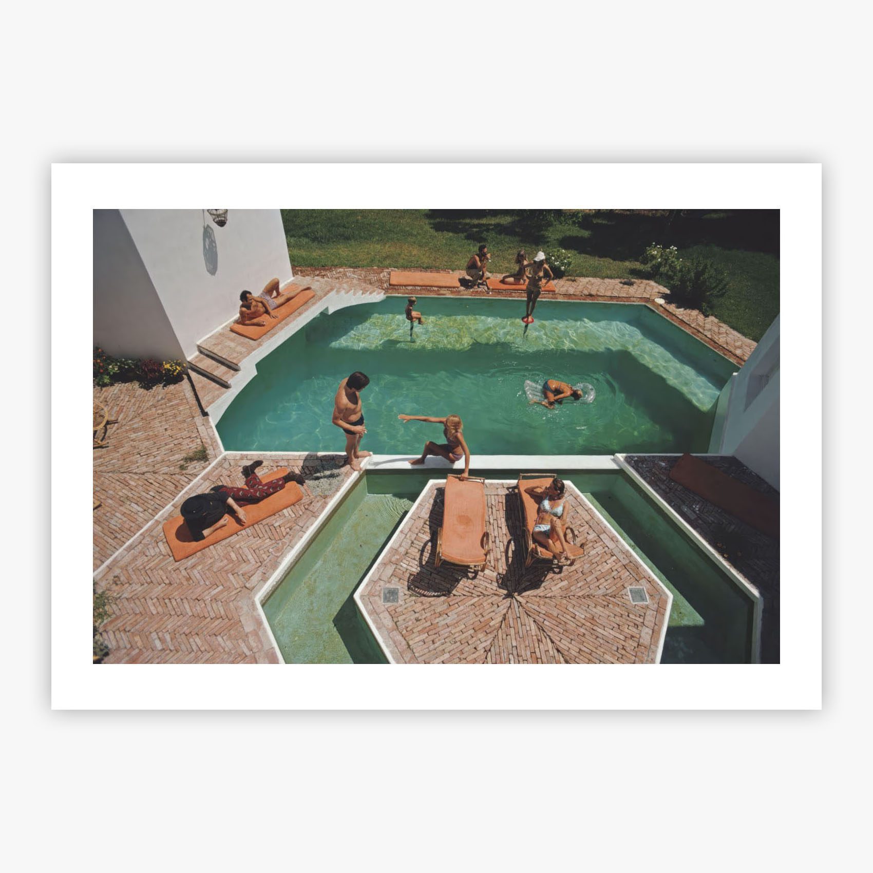 El Cuarton captures the essence of mid-century luxury living in this vibrant Spanish retreat, where Slim Aarons reveals sun-drenched leisure unfolding beside a uniquely designed pool. The striking aerial perspective showcases geometric pool shapes weaving through terracotta tiled terraces, while guests in sophisticated resort wear lounge on burnt orange chairs beneath the warm European sun. The harmonious palette of glistening aqua waters, rustic brickwork, and golden afternoon light embodies the timeless glamour that made this photographer's eye for elegance legendary.