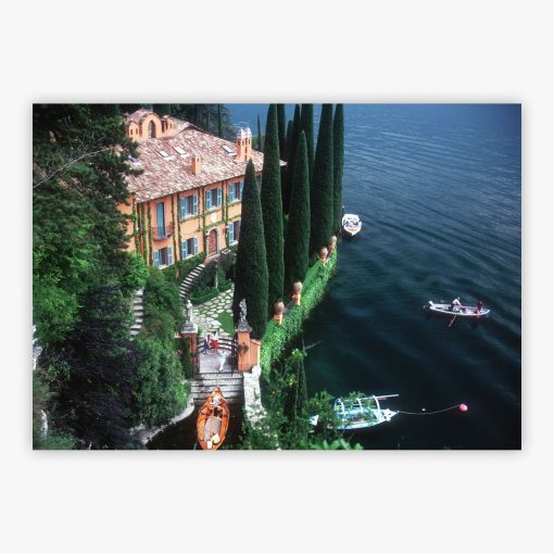 The sun-drenched allure of Lake Como in the 1980s provides a stunning stage for this portrait of power and effortless style. In Giacomo Montegazza, the legendary photographer Slim Aarons captures more than just a man on a boat; he documents the very essence of la dolce vita. The image presents Italian industrialist Giacomo Montegazza navigating the iconic lake in his personal speedboat, the vessel’s polished mahogany hull cutting a sharp line through the water. In the background, the stately presence of his villa sits nestled against the lush shoreline, a quiet confirmation of his place in this world of refined pleasure.