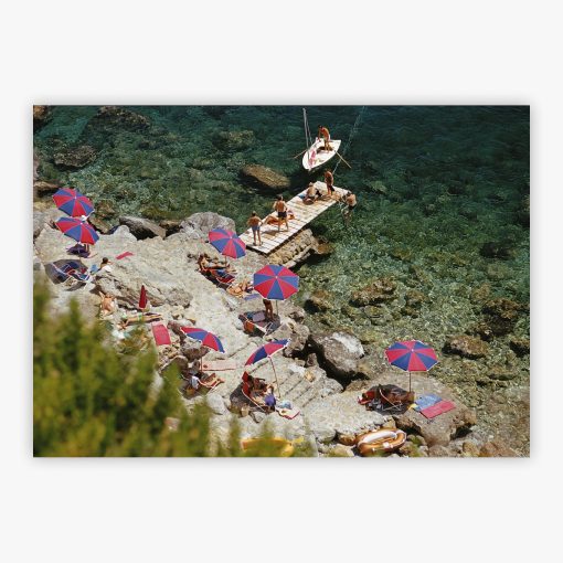 Il Pellicano Beach captures the exquisite democracy of Italian coastal luxury, where fifteen sun-seekers scatter across layered limestone terraces beneath six distinctive blue and red sectioned umbrellas that punctuate this celebrated rocky shore. Slim Aarons reveals this remarkable convergence of natural beauty and casual elegance at Porto Ercole's most celebrated retreat, where striped loungers perch on weathered stone platforms and a wooden jetty extends invitingly into flawless jewel-toned waters that reveal every rock beneath their remarkably transparent surface.