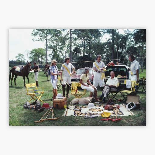 Polo Party captures three generations of America's foremost polo dynasty gathered on a Palm Beach field in April 1981. Six members of the Butler family, including patriarch Paul Butler who founded Oak Brook Polo Club and won six U.S. Open Championships, pause during their match alongside two dark polo ponies held by handlers. Yellow director's chairs and matching sashes worn by the standing players create a coordinated elegance, while multiple mallets rest artfully on a cream blanket beside red polo balls. This photograph by Slim Aarons brings sporting aristocracy's golden age directly into your sophisticated home.