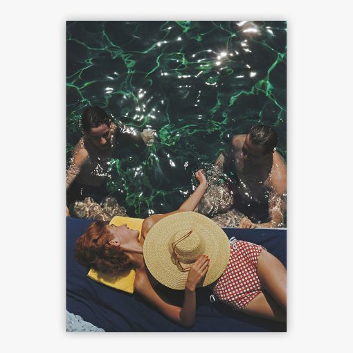 From a bird’s-eye view, the emerald green water of a swimming pool sparkles, creating a jewel-like oasis high above a Swiss lake. This is Poolside At The Burgenstock Estate, a masterful 1958 photograph by Slim Aarons. The scene is set at the exclusive Burgenstock Estate in Switzerland, where a woman in a red polka-dot swimsuit and a wide-brimmed straw hat relaxes at the water’s edge. Her face is hidden, creating a sense of mystery and serene anonymity, while two men enjoy the cool water nearby.