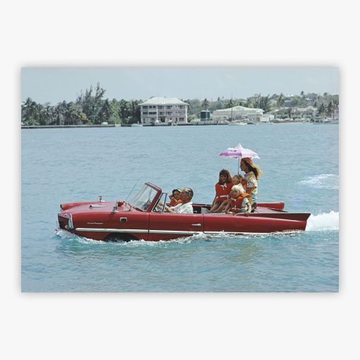 Sea Drive captures film producer Kevin McClory piloting his striking burgundy Amphicar across Nassau harbour's sapphire tropical waters on January 1, 1967. Slim Aarons recorded McClory at the wheel with wife Bobo Sigrist standing gracefully, her pink and white striped parasol catching the ocean breeze, while their children enjoy this remarkable aquatic adventure in the Bahamas. The gleaming red vehicle with its distinctive chrome trim creates a gleaming wake as it glides past palm-lined shores and white colonial architecture, instantly enriching your cultivated living space into a captivating window to jet-set island glamour.