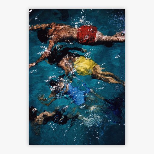The crystal-clear turquoise waters captured in Swimming In The Bahamas shimmer under the brilliant Caribbean sun, creating a luminous aquatic canvas where vibrant swimmers float in perfect leisure. In 1959, Slim Aarons photographed this captivating overhead view in Nassau, New Providence Island, where brightly colored swimwear creates a striking kaleidoscope against the pristine Bahamian waters, each swimmer positioned like a floating work of contemporary sculpture.