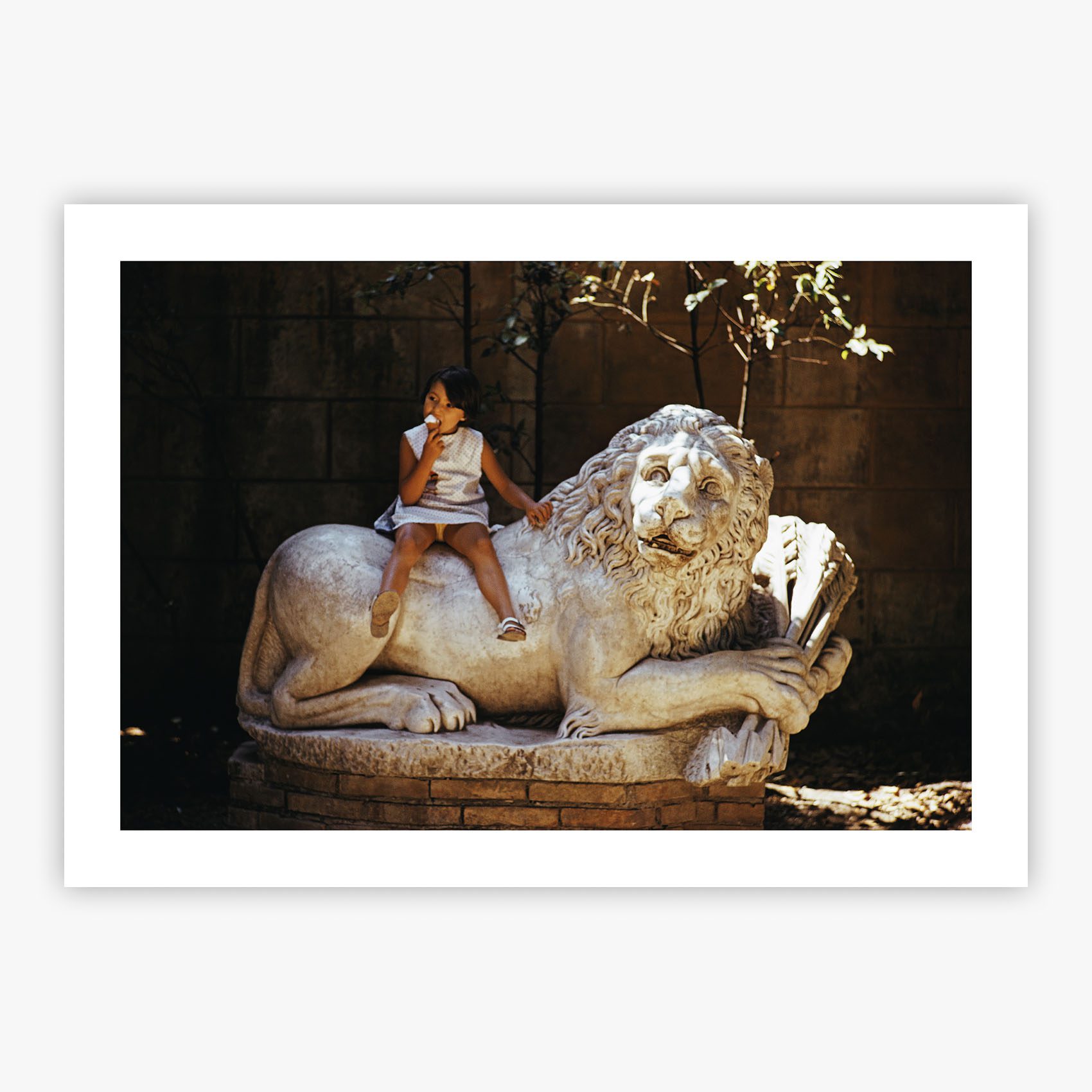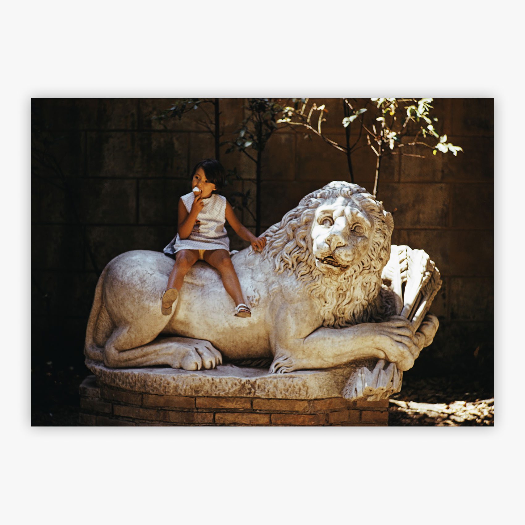 Villa Borghese Lion captures a spontaneous Roman summer scene, rendered through Slim Aarons lens with the warmth and clarity that defines his celebrated portfolio. In the dappled shade of Villa Borghese’s storied gardens, a young girl perches confidently atop a weather-softened marble lion, enjoying her gelato as though it were a throne-room treat. The cool stone and playful posture create a charming contrast, fusing centuries-old sculpture with the carefree spirit of 1970s childhood.