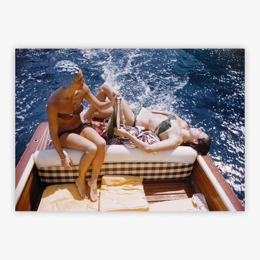 Vuccino and Rava reveals two Roman beauties at play on a polished mahogany cruiser drifting off Capri in July 1958. Carla Vuccino, her chestnut hair protected beneath a practical swimming cap, reclines beside Marina Rava, whose sun-bronzed shoulders gleam against the Tyrrhenian blue. Their coordinated bikinis – one aqua, one emerald – speak to natural elegance even in casual moments, while their relaxed postures suggest the easy intimacy of longtime confidantes. Slim Aarons captured this privileged tableau from his insider position within Continental society circles, preserving a fleeting afternoon when laughter replaced formality.
