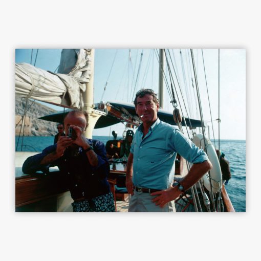 Imagine a sun-drenched afternoon where sophistication dances with relaxed charm, encapsulated in a frame of timeless Italian grace. This exquisite piece, a photographic treasure by Slim Aarons, invites you aboard an opulent yacht near Capri in the golden days of late summer 1968. The enchantment lies not only in the breathtaking vista but in the photographer himself, elegantly poised on the right, capturing an essence of La Dolce Vita that whispers to both artists and collectors alike.
