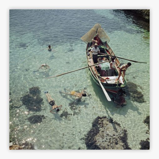 Snorkeling In The Shallows captures a spirited group embarking on an underwater adventure off the coast of Malta in 1959, where Slim Aarons documented the simple pleasure of exploration from a quaint wooden boat. The crystalline Mediterranean waters invite discovery as snorkelers prepare to dive beneath the surface, their anticipation visible in every gesture. Aarons' lens preserves this moment of freedom and leisure, transforming your wall into a portal to the unhurried days when adventure meant a boat, clear water, and good company beneath the Maltese sun.