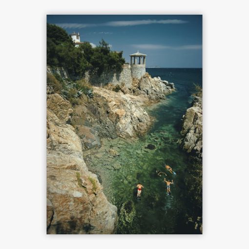 Swimming In Spain transports you to the sun-drenched summer of 1970 at Hostal De La Gavina in S'agaró, Costa Brava, where Slim Aarons captured swimmers and snorkelers reveling in the pristine Mediterranean bay. The turquoise waters shimmer beneath the Spanish sun as figures drift through the crystalline depths, some exploring the underwater world while others lounge on the shoreline. Rocky outcrops frame the intimate cove, where whitewashed architecture meets the sea, creating a scene of effortless Mediterranean luxury that defined an era when life's simple joys took center stage.