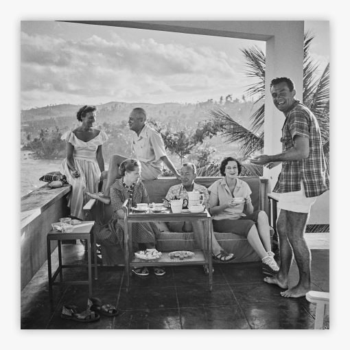 Tea Time In Jamaica brings you to a sun-drenched afternoon in 1950, where Slim Aarons captured actress Joyce Carey, producer John C. Wilson, Princess Natalia Paley, playwright Noël Coward, Lady Rothermere, and actor Graham Payn gathered for an elegant tea-time soirée on Jamaica's golden shores. The composition radiates the warmth of Caribbean sun and the genuine camaraderie of distinguished company, preserving a moment when leisure and sophistication defined the season's most coveted gathering spots. Each detail—from the relaxed postures to the tropical setting—speaks to an era when style and substance merged effortlessly.