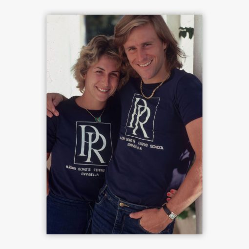 Tennis Newlyweds captures tennis legends Bjorn Borg and Mariana Simionescu in the summer of 1980, their matching Bjorn Borg tennis school t-shirts announcing their shared passion against Marbella's sun-drenched Mediterranean backdrop. Slim Aarons photographed this intimate moment where sport meets romance, the couple's relaxed postures and genuine smiles revealing the ease of newlywed life lived in the public eye. The warm Spanish light bathes the scene in golden tones, while the casual elegance of their matching attire speaks to an era when athletic legends embodied both competitive excellence and lifestyle aspiration, creating a visual narrative that resonates with anyone who appreciates the intersection of love, sport, and the carefree spirit of summer at the height of tennis's golden age.